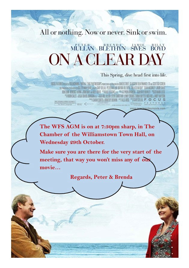 Learn More2025 AGM & Our film ON A CLEAR DAY (Scotland, 2005, Comedy/Drama, 98min, colour, PG) After losing his job at a Glasgow shipyard, 50-year-old Frank (Peter Mullan) has few prospects and little hope. A casual remark by a buddy (Billy Boyd) inspires him to find a new purpose: to swim the English Channel. Also stars Brenda Blethyn, well know to Melbourne audiences as DCI Vera Stanhope, yes luv, that Vera! Prior to our screening we will hold the 2025 AGM. Meeting documents will be emailed out to members in early October and will also be available on the WFS website.